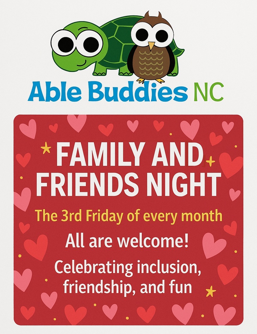 If you would like more information about next month’s Family and Friends Night you can follow us on our Facebook page Able Buddies NC Family and Friends Night, or email Aileen@AbleBuddiesNC.org.
